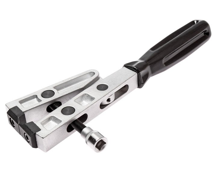 Съемник хомутов ШРУСа ленточных (клещи усиленные). Предназначены для установки стальных ленточных хомутов на приводные валы с определенным моментом затяжки. Используются с динамометрическим ключом 3/8″. Изготовлены из хром-молибденовой стали, отличаются жесткостью и долговечностью.